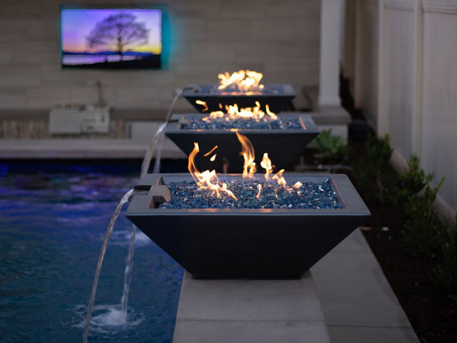 Fire and water bowls bring movement, ambiance, and visual drama to outdoor living spaces, combining the warm glow of fire with the soothing sound of flowing water. They serve as eye-catching focal points for pools, patios, and landscape designs while creating atmosphere, warmth, and a resort-style experience that enhances evening gatherings and daytime relaxation.